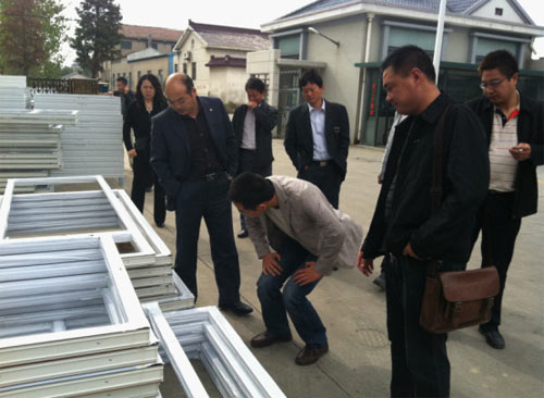 參觀人員查看宏夏公司生產(chǎn)的半成品塑鋼門窗