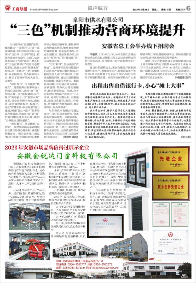 獲得“2023年安徽市場(chǎng)品牌信得過(guò)企業(yè)”展示既是對(duì)金銳達(dá)門(mén)窗的肯定,也是對(duì)金銳達(dá)門(mén)窗的鞭策,今后我司將繼續(xù)貫徹誠(chéng)信之道,在“以誠(chéng)取信,以信取譽(yù),以譽(yù)取益”的基礎(chǔ)上,誠(chéng)信服務(wù)客戶(hù),再接再厲,再創(chuàng)新臺(tái)階。